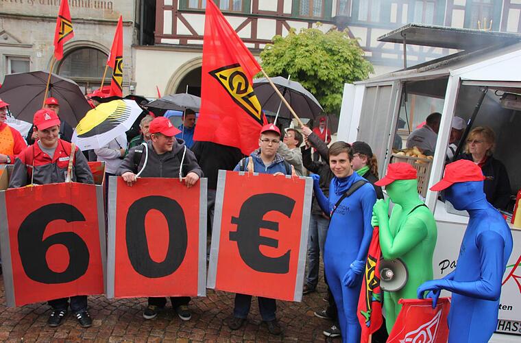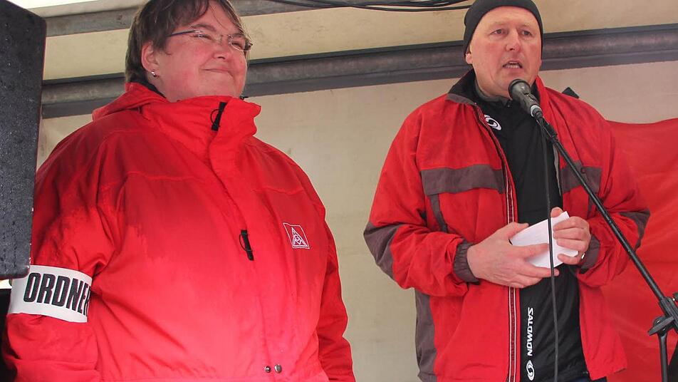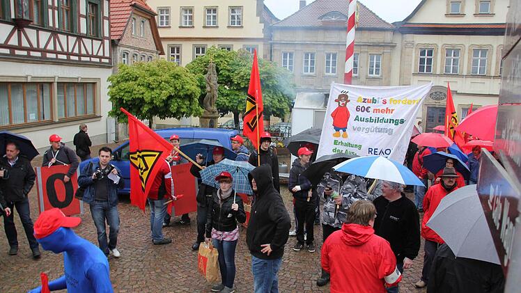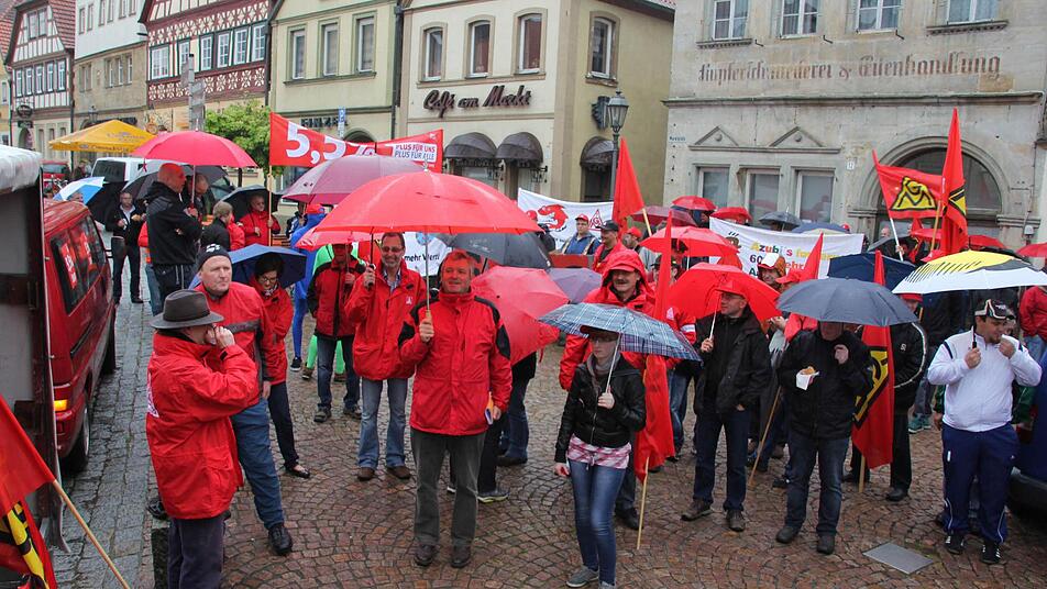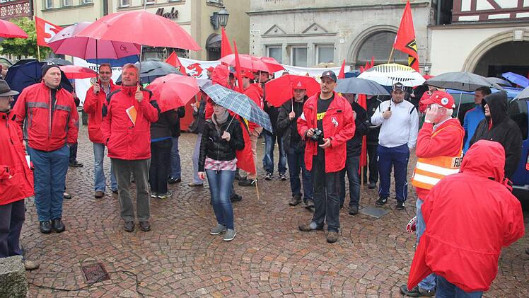 IG-Metall-Vollmächter Matthias Gebhardt dankte den Kundgebungsteilnehmer, dass "sie bei diesem Sauwetter zum Marktplatz raufmarschiert sind". Von 600 Beschäftigen auf der Schicht hätten 550 die Arbeit niedergelegt. "Das zeigt, dass die Belegschaft hinter unseren Forderungen steht und ökonomischen Druck auf die Arbeitgeber ausüben will."