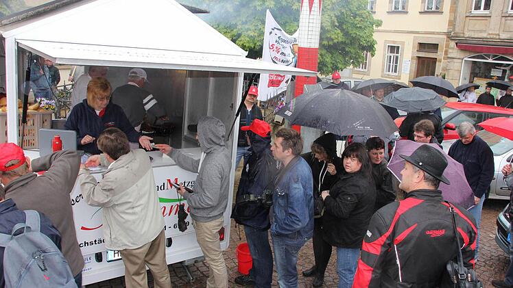 Aufgeheizte Stimmung? Nur am Grill der Bratwurstbude. Darin wurde auch Schwerstarbeit geleistet, während die Davorstehenden mit einem Warnstreik ihren Unmut über das Tarifangebot der Metallarbeiter lautstark kundtaten. Für mehrere Stunden legten 550 von 600 Schichtarbeitern bei FTE automotive am Montagvormittag die Arbeit nieder und die Produktion lahm. Und mit dem Demonstrationsmarsch vom FTE-Werk zum Marktplatz wurde zeitweise auch der Verkehr in der Innenstadt in ein Chaos gestürzt, zumal sich einmal mehr ein 40-Tonner durch die Engstellen quälte.