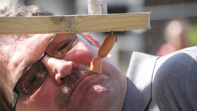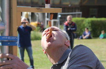 Würstchen und Schnaps gab es an der dritten Station und somit die erste Belohnung für bisherige Mühen. Zwei Mannschaften mit je vier Teilnehmern mussten einen Parcours überwinden, um an vier kleine Würstchen zu gelangen, die in Kopfhöhe aufgehängt waren. Ohne die Hände zu benutzen, musste jeder Teilnehmer ein Würstchen abbeißen. Hier waren mitunter komische Gesichtszüge und Verrenkungen zu beobachten. Danach galt es, ein kleines Schnapsfläschchen ebenfalls nur mit den Mund aufzunehmen und zu leeren.
