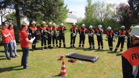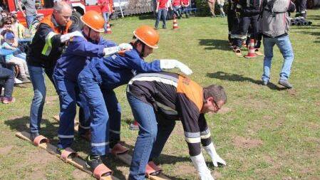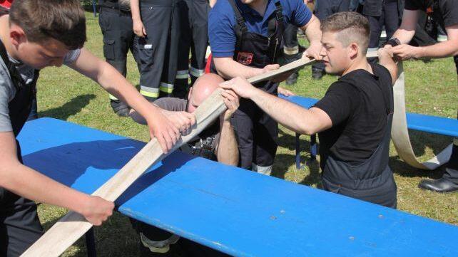 Nass wurde es zu guter Letzt. Sechs Spieler mussten zusammen wirken. Gefüllt werden musste, über Hindernisse hinweg, mit einem Feuerwehrhelm eine Kübelspritze. Gemessen wurde, wie viele Zentimeter Wasserhöhe nach drei Minuten die Kübelspritze aufwies. Zielspritzen in einen Eimer über zehn Meter Entfernung hinweg war dann angesagt.