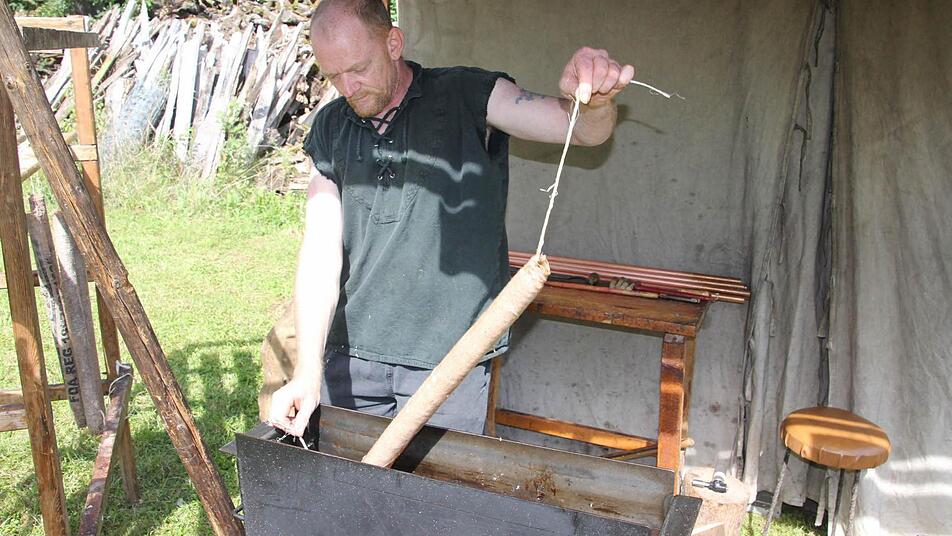 Landsknechte ihn ihren prächtigen Gewändern durchstreiften den Schlosspark und zogen unweigerlich die Blicke der Besucher auf sich. Versuchen konnte man sich beim Bogenschießen oder auch einem Falkner über die Schulter blicken. Die Gäste konnten verfolgen, wie man wie Fackeln hergestellt, die früher Schloßhöfe- und Parks beleuchteten. "Nestlerey" war zu sehen, die Herstellung von Lederschnüren und dünnen Riemen. Nestler oder auch Senkler genannt war ein Handwerksberuf im Mittelalter.