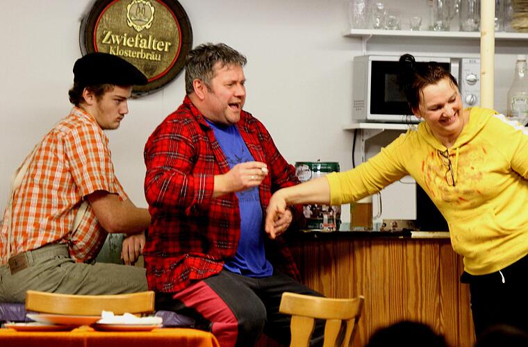 Was geschieht, wenn man sich Geld für einen Gourmettempel leiht und stattdessen nur eine Eckkneipe aufmacht? Da kann es schon einmal zu Panik bei der Wirtin kommen. Davon konnte man sich ein Bild machen bei dem Stück "Kaviar trifft Currywurst", das die Theatergruppe Kirchlauter derzeit im Oskar-Kandler-Zentrum zum Besten gibt.