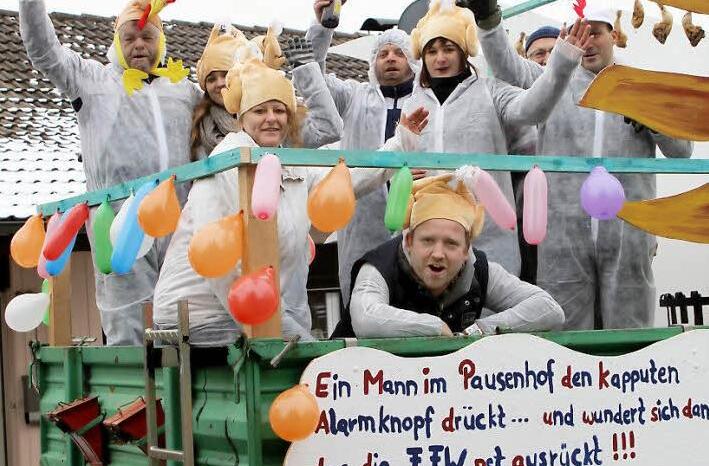 Die Wagen befassten sich mit lokalen Themen wie den verbrannten Hähnchen beim Keglerfest, dem eigentümlich Schotter abkehren auf öffentlichen Plätzen oder auch dem Entfernen des Hinweisschildes für ein Musikerfest, weswegen die Musiker in Schafspelz kamen und zukünftig Schafe mit Buchstaben aufstellen wollen.