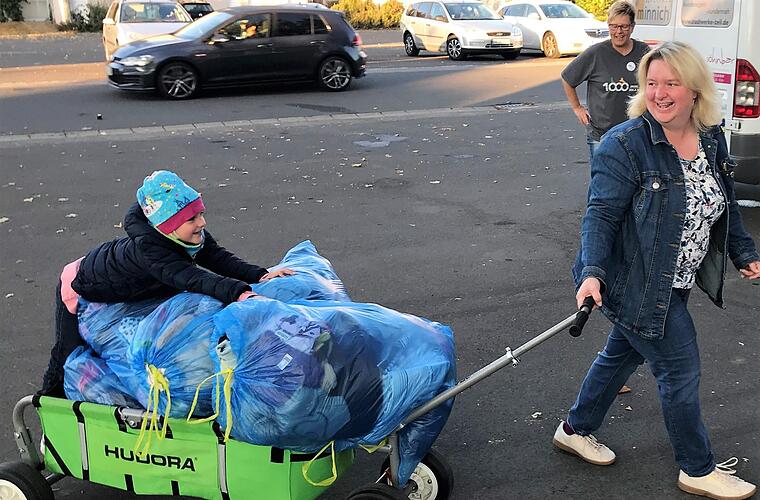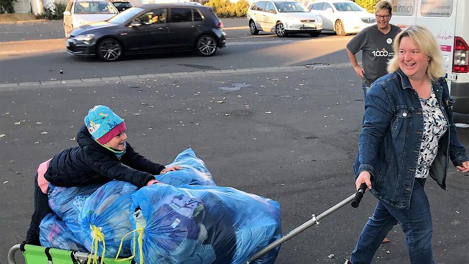 Eine ganze Stadt ist auf den Beinen für einen guten Zweck. Zusammenhalt und Wir-Gefühl sind spürbar: Mit Begeisterung unterstützen die Zeiler die Wettaktion zwischen Bürgermeister Stadelmann und dem BRK-Kreisverband Haßberge. "1000 Jahre Stadt Zeil - 1000 Altkleidersäcke" - so war die Aktion überschrieben, die sich die beiden BRK-Mitarbeiterinnen Ingrid Böllner und Simone Gilley ausgedacht hatten.