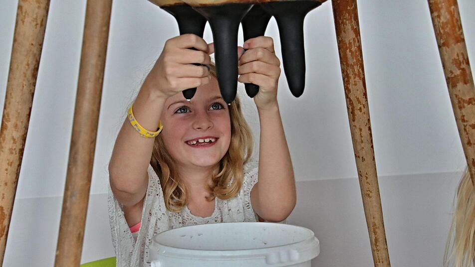 Vorhanden ist auch das schwarze Melkeuter der Kuh "Elsa". Dass es gar nicht so leicht ist, eine Kuh per Hand zu merken, müssen alle Kinder feststellen, die sich hier versuchen. Zoe umfasst mit beiden Händen je ein Euter, zieht und drückt, aber das mit Wasser gefüllte Euter tröpfelt nur leicht. Dass das in die Finger geht, merken die Kinder schnell und können so abschätzen, dass auch Kuhmelken per Hand gelernt sein muss.