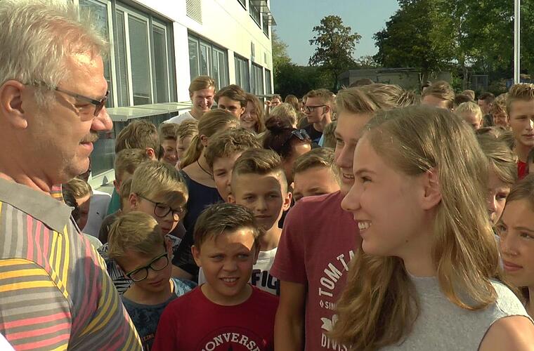 Kim Davey und Jörg Gramlich organisierten als Lehrer spontan eine kleine Verabschiedung. Geschickt sorgte die Lehrerin unter einem Vorwand dafür, dass "Nobby", wie der Hausmeister liebevoll genannt wird, nicht mitbekam, wie sich die rund 1000 Schüler des Regiomontanus-Gymnasiums ins Freie bewegten. Mit einer großen La-Ola-Welle und Beifall wurde er völlig überrascht.