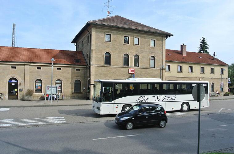 Vor dem Bahnhof warten die Taxis. Der Haßfurter Bahnhof ist für den ganzen Landkreis Haßberge ein zentraler Knotenpunkt des Öffentlichen Nahverkehrs.