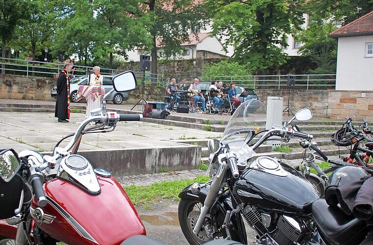 Bei einem Bikergottes- dienst in Ebern hielten Radler und Motor- radfahrer gemeinsam inne.