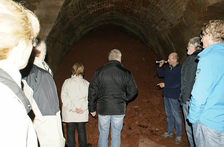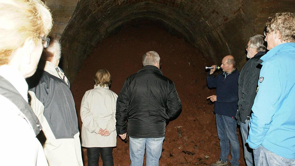 Neun Stollen mit 1,5 Kilometern Gesamtlänge sind in Ebelsbach Relikte der Kriegsproduktion unter der Erde. Heute wird dort Sekt gelagert, wie der Lions- und der Rotary-Club bei einer Besichtigung erfuhren.