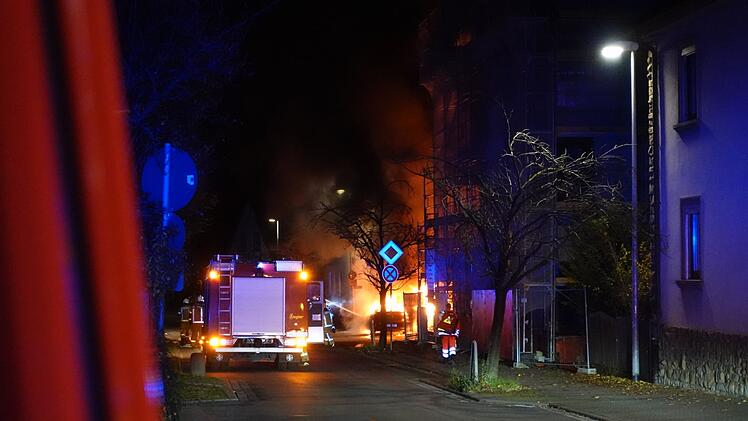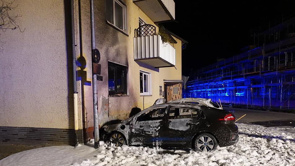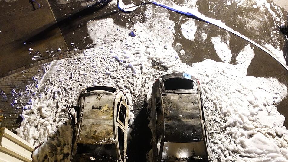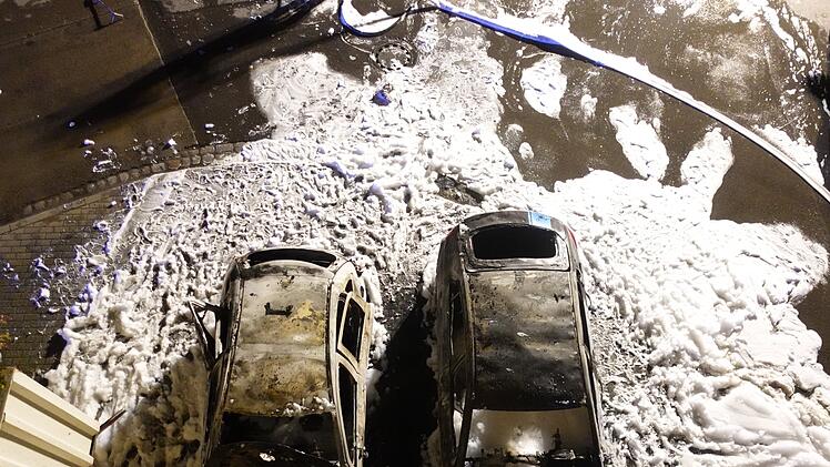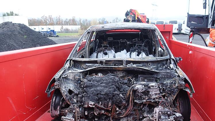 In Haßfurt brannten zwei Fahrzeuge komplett ab. Da auch ein Elektrofahrzeug darunter war, gestaltete sich die Bergung für die Feuerwehr besonders schwierig.