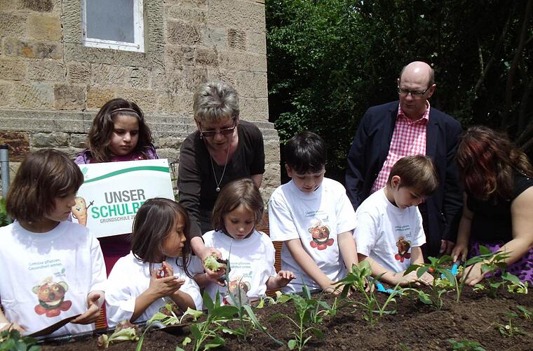 Sauber geplant von Maria Reinwand, sitzen da nun Erdbeeren, Auberginen, Paprika, Kohlrabi, Schnittlauch, Petersilie, Dill und Lauch. Der Salat hatte Glück, dass er den Boden fand, denn die Kinder hätten ihn am liebsten gleich weggefuttert. Mit den Hochbeeten geliefert wurden die nötigen Werkzeuge für die Kindergärtner der drei Mittagsbetreuungsgruppen, die nun einen Anlaufpunkt mehr in "ihrem" Garten haben.