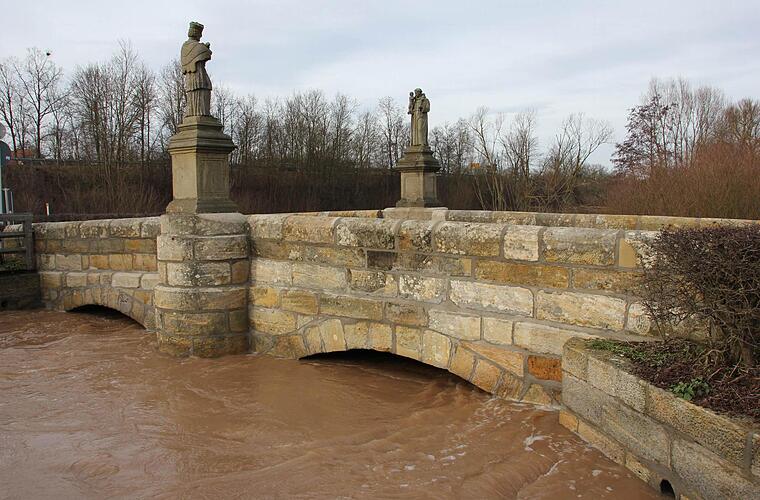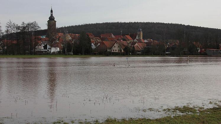 Die Hoffnung auf "weiße Weihnacht" ging sinnbildlich den Bach hinunter: Die milden (Rekord-)Temperaturen am Heiligabend sowie die ergiebigen Regenfälle am Wochenende ließen die letzten Schneefelder schmelzen und die Flüsse anschwellen. So war - einmal mehr - die (Noch-)Staatsstraße, die durch Ebern führt, nicht mehr passierbar.