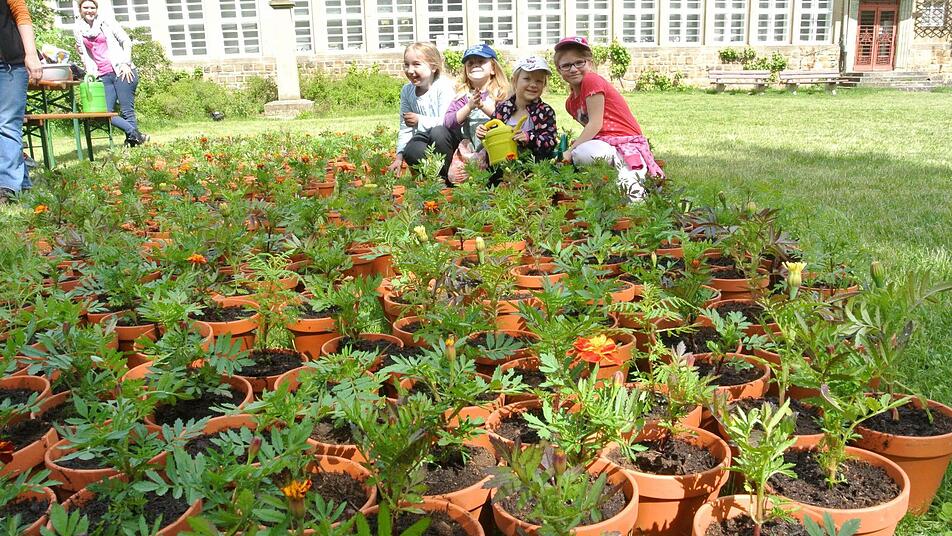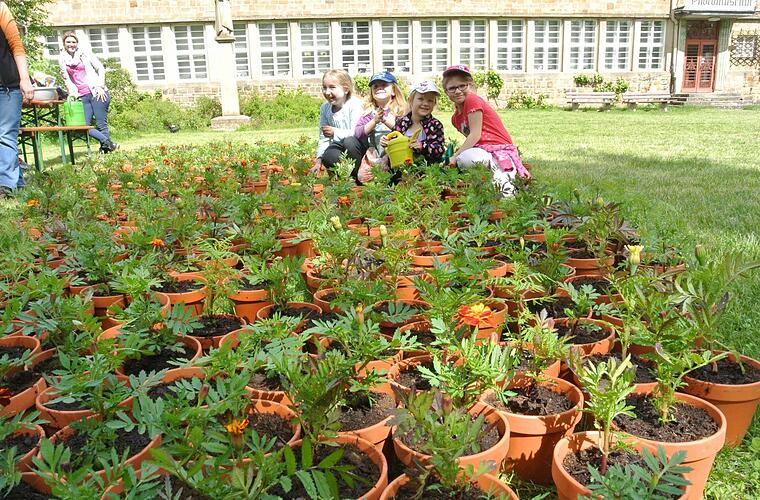 Dort hatten einige Helfer um den Vorsitzenden Günter Schneider ein paar Bierbänke und Biertische aufgebaut. Kübel mit Erde zurechtgestellt und natürlich jede Menge Tontöpfe. Gärtner Eckehard Maurer hatte die Vorarbeit geleistet: Hunderte Tagetes zog er zu kräftigen Pflänzchen heran, so dass sie das Verpflanzen durch die Kinderhände ganz gut überstanden.