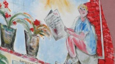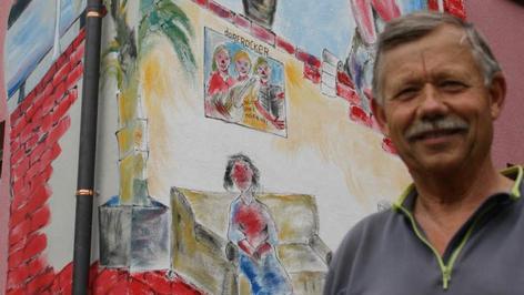 Gerade hat der Maler sein Gerüst abgebaut und den Blick auf ein Wandbild frei gegeben, das es in sich hat. "Manche Leute bleiben stehen, viele schmunzeln," berichtet Hausbesitzer Andres Geus, Und mancher signalisiere mit erhobenem Daumen Zustimmung zu der farbenfrohen Malerei: "Super!".