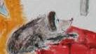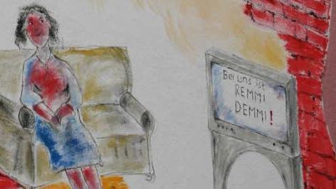 Das Gemälde suggeriert eine aufgerissene Hausecke, die den Blick in die Wohnung gewährt. Während sich's im Erdgeschoss eine Frau auf dem Sofa vor dem Fernseher bequem gemacht hat, sitzt oben im Bad ein Mann Zeitung lesend auf dem Lokus.