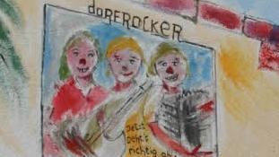 Dem Betrachter strahlen die Drei von einem Wandbild über dem Sofa entgegen, und "Dorfrocker-Zitate an der Fassade verheißen "Jetzt geh's richtig ab" und "Bei uns ist Remmi Demmi". Damit spitzt der Spaßvogel Geus nicht nur auf den Titel der aktuellen "Dorfrocker"-Platte an, er macht auf seine Weise auch dem Ärger über frühere Mieter in dem Haus an der Eberner Albrecht-Dürer-/Mozartstraße Luft. "Hier hat es ständig Zirkus gegeben." Das Wohnhaus gehört dem Ruheständler schon seit 1994, doch in jüngster Zeit hatten sich schlechte Erfahrungen mit den Bewohnern gehäuft. Sie sind inzwischen ausgezogen.