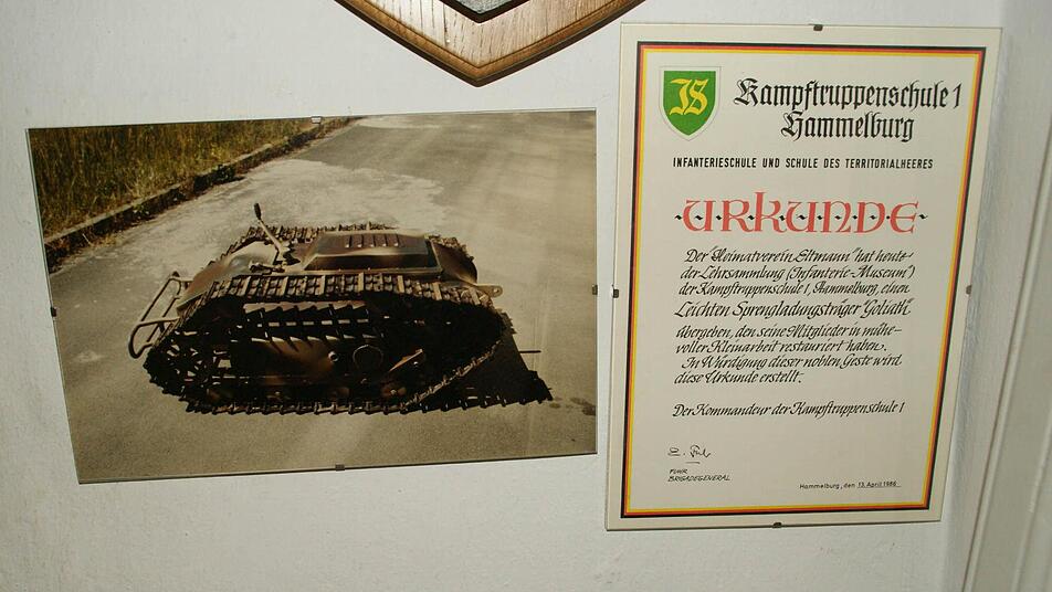 Als der Panzer in Eltmann war Ein Stockwerk höher erklärt Günter Rausch einem überraschten Gast, dass der Heimatverein Eltmann einmal einen Panzer restauriert hat. "Goliath" war allerdings ein sehr kleiner Panzer, genauer ein "Leichter Sprengladungsträger". Den restaurierten die Eltmanner Mitglieder des Heimatvereins "in liebevoller Kleinarbeit", wie die Dankurkunde besagt. Dann stifteten sie ihn der Lehrsammlung der Kampftruppenschule in Hammelburg, die als Infanterie-Museum bekannt ist. Ein Bild und die von Brigadegeneral Fuhr unterzeichnete Dankurkunde belegen diesen besonderen Einsatz des Vereins.