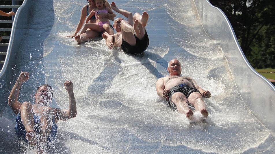 Politiker lassen nur ungern die Hosen runter. Gestern taten sie es aber mit offenkundiger Freude: Kurz nach den Festreden zur Eröffnung des neuen Hofheimer Freibads am Freitagnachmittag war Schluss mit Anzug und Krawatte oder Kleid. Bürgermeister Wolfgang Borst, Landrat Wilhelm Schneider, Bundestagsabgeordnete Dorothee Bär und Landtagsabgeordneter Steffen Vogel (alle CSU) wollten die Rutsche einweihen, und das auf die pragmatischste aller Methoden: raufklettern, runterrutschen, und nochmal von vorn.