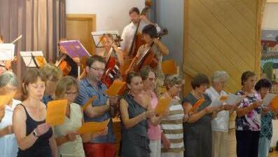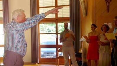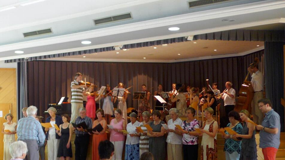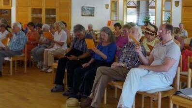 Auch Sänger fehlten nicht - Laien aus der näheren Umgebung trällerten gemeinsam mit den gestandenen Profis. Christine Ledermann und Susanne Sorgenfrei, die im Kammerchor Ebern bei Ulrike Zeidler singen, waren dabei. Ebenso Anna Bauer, die außer hier im Kammerchor auch im "Extra-Chor" des Coburger Landestheaters mitwirkt, wie auch Eric Fergusson, Dolds ehemaliger Schüler und jetzt in München lebender, konzerterprobter Sänger. Er war mit seiner Frau und deren Schülerinnen angereist.