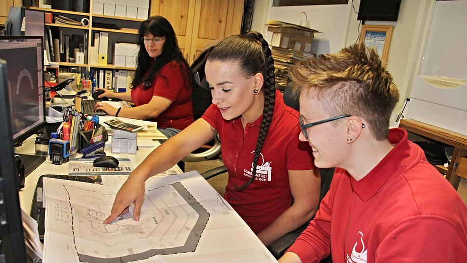 Im Büro am Computer sitzt die Chefin, Marianne Och. Die lässt auf "ihre Mädels" nichts kommen. "Die sind beide auf Zack und tragen zu einem guten Arbeitsklima in der Firma bei. Sie fügen sich gut in unser Team ein und kommen bei Kunden gut an", lobt die Chefin, was den Mädels einen zufriedenen Gesichtszug aufs Antlitz zaubert. Marianne Och weiß, dass die Mädchen auch mal an ihre Grenzen der körperlichen Belastung kommen. "In der Industrie hast du für Lasten Hilfsmittel, bei einer kleinen Schreinerei wie unsere, ist das nicht immer möglich", sagt Marianne Och.