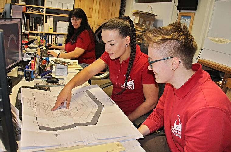Da fällt ihr die kecke Selina ins Wort: "Ich brauche, seit ich arbeite, kein Fitnessstudio mehr." Sie erzählt, dass sie und ihre Kollegin auf Baustellen, wo andere Firmen tätig sind, von den Männern schon mal "blöd angemacht" werden. "Wenn die aber sehen, wie Svenja und ich arbeiten, werden ihre Sprüche leiser." Wie die Mädels im Beisein der Chefin reden, zeigt, dass das Verhältnis zwischen Chefs und Belegschaft sehr gut sein muss. "Wir sind wie eine große Familie und verstehen uns super", sagt der "Stift" im zweiten Lehrjahr, Svenja Hastedt. Gesellin Selina ergänzt: "Wir können mit Chef und Chefin stets ein offenes Wort sprechen, wir erfahren viel, was im Büro abläuft, wissen was unsere Kunden von uns erwarten und das motiviert uns auch besonders bei Neukunden", sagt die junge Schreinergesellin.