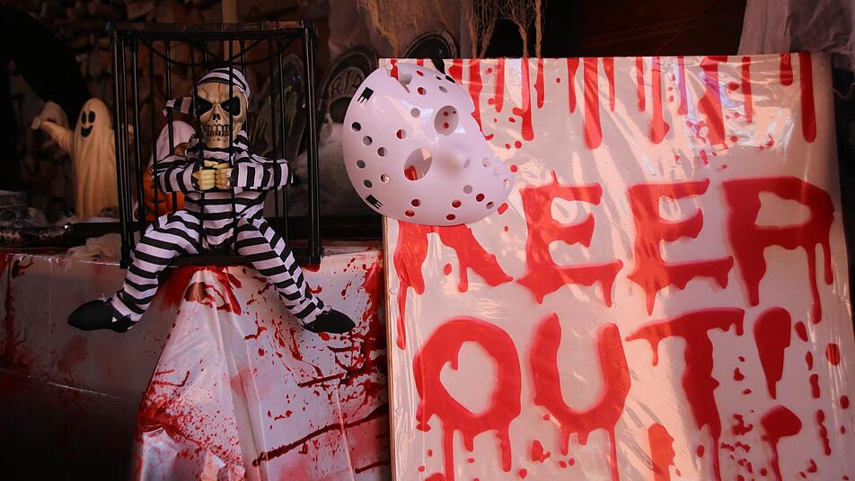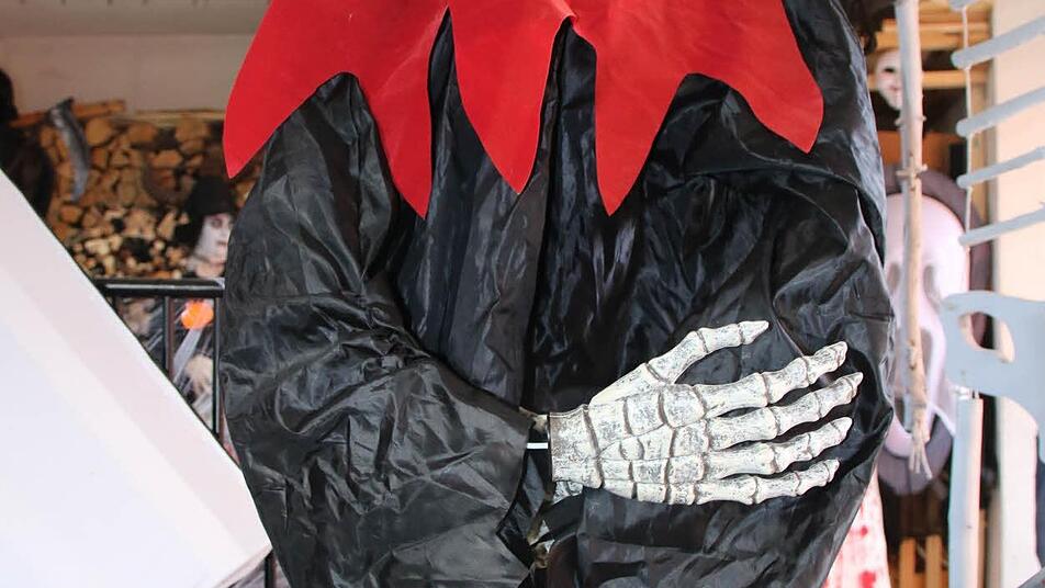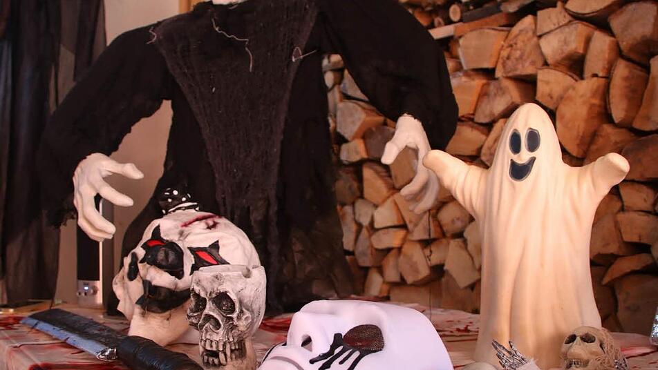 Vor dem Betreten von Kai Hopfes Haus in Stettfeld ist einem ein wenig mulmig zumute. Bereits auf dem Weg zur Garage hört man leise Musik. Es sind zwar keine Schreie oder Ähnliches zu hören, trotzdem hat es etwas Bedrohliches. Auf einem Tisch, der aussieht, als wäre er mit Blut beschmiert, liegen verschiedene Masken und Geisterfiguren. Plötzlich ertönt ein tiefes "Ha, ha, ha".