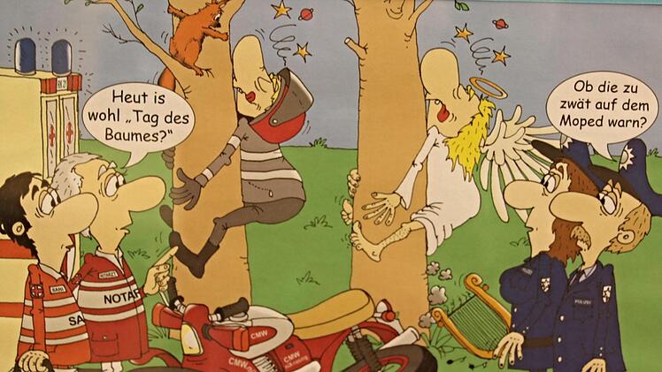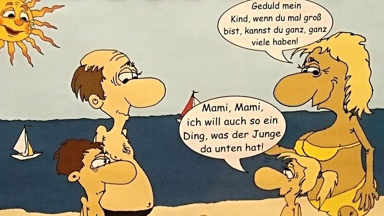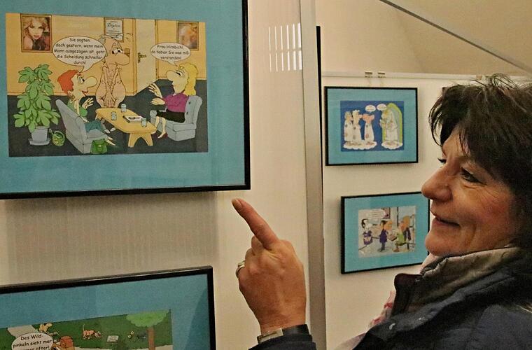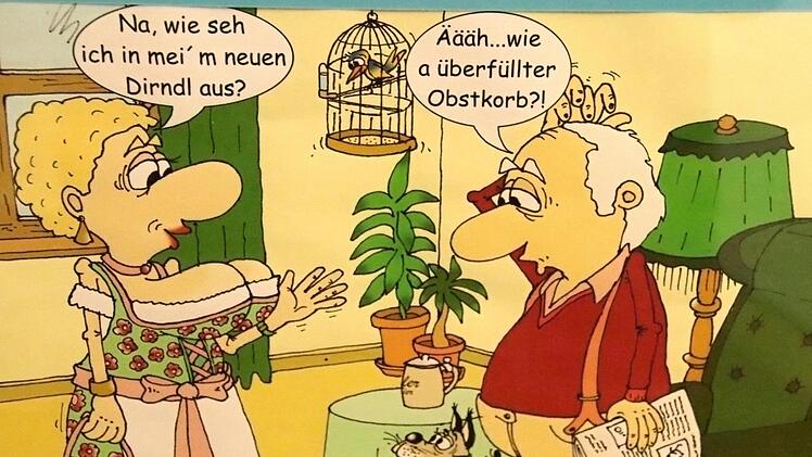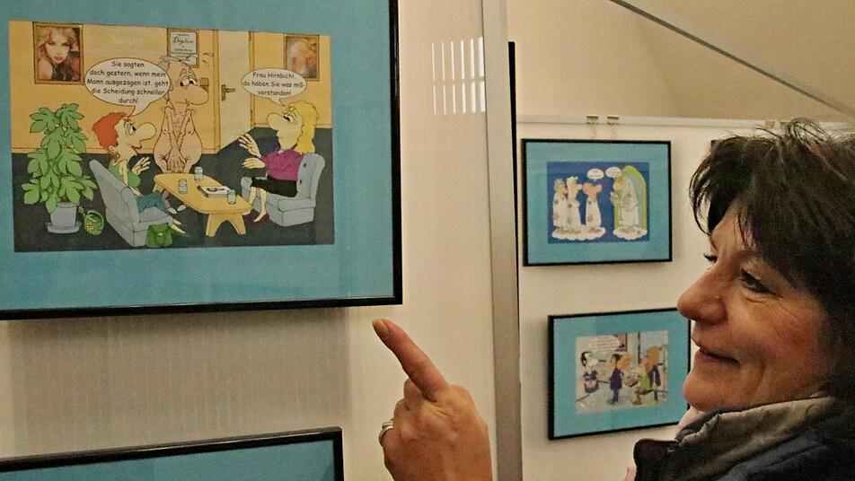 Angefangen hat es bei ihm dann später mit Karikaturen, indem er lustige Geburtstagskarten entwarf, bis er schließlich, wie er sagt, beim "fränkischen Humor" gelandet ist. So sind in der Ausstellung kuriose Karikaturen zu sehen, die oft das Leben schreibt. Die Ideen kommen ihm auch an verschiedenen Orten, beim geselligen Grillabend, am Flughafen oder in der Sauna, um einige Beispiele zu nennen.