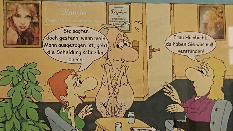Ingrid Dietz, die Gattin des Bürgermeisters, wird schmunzelnd vor einem Bild angetroffen. "Das gefällt mir", sagt sie. Dort ist in einem Büro für Eheberatung eine Frau zu sehen, die der Beraterin gegenüber sitzt. In der Mitte steht ihr Mann, nackt. Dessen Frau zur Beraterin: "Sie sagten doch gestern, wenn mein Mann ausgezogen ist, geht die Scheidung schneller durch", worauf die Beraterin antwortet: "Frau Hirnbichl, da haben sie was missverstanden."