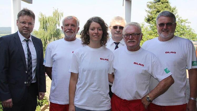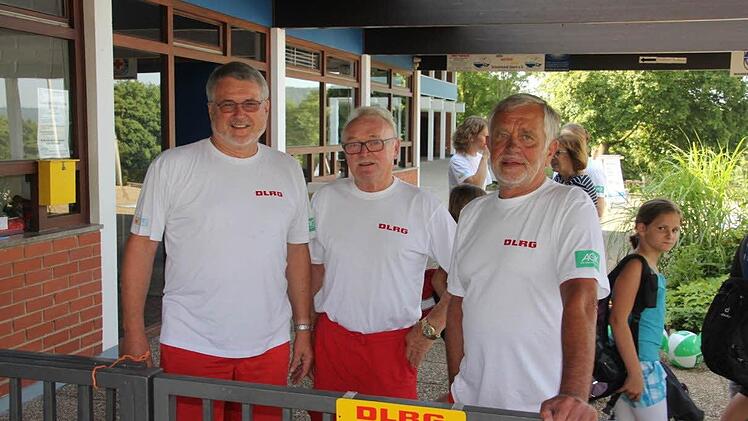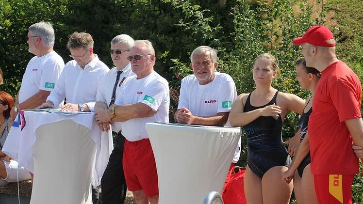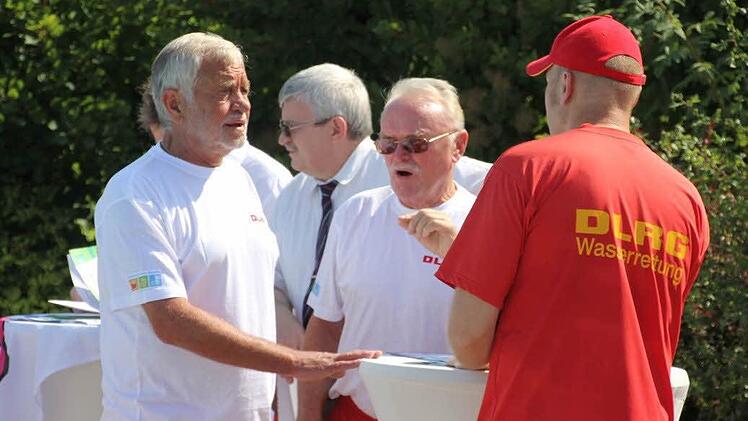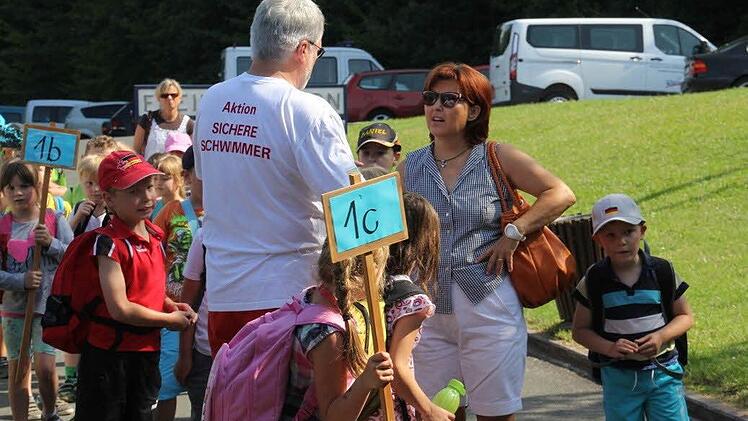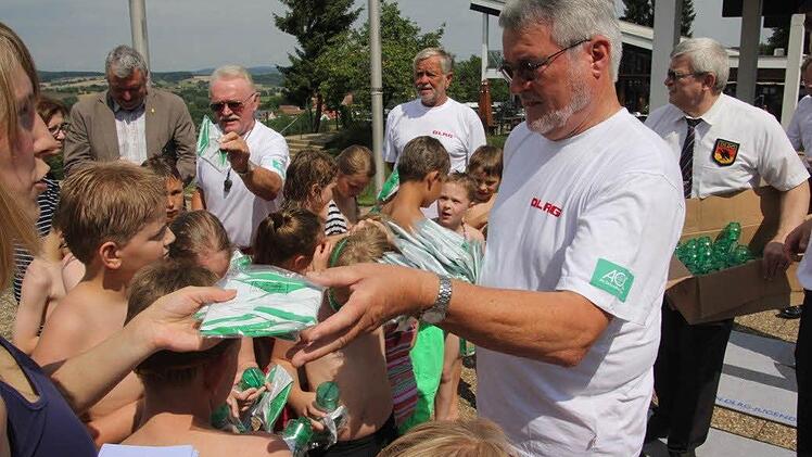 Am Eingang des Freibades wurden die Kinder mit ihren Lehrkräften vom Vorsitzenden der DLRG-Ortsgruppe Ebern, Rudi Rath und seinen Vereinskameraden Harald Theuring und Klaus Bayersdorfer, als alte Bekannte begrüßt. Sie waren es, die den Kindern das Element Wasser nahegebracht und sie zu Schwimmern ausgebildet hatten. Erwartet wurden die Kinder außerdem von Alfred Eitel aus Würzburg, Kommissarischer Technischer Leiter der DLRG im Bezirk Unterfranken, Elisa Klum aus Neumarkt/Oberpfalz, Projektleiterin der DLRG-Jugend in Bayern, sowie von Gebhard Götzl uns Andreas Herrlein von der AOK Schweinfurt.