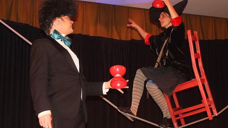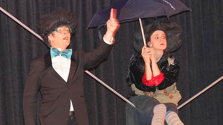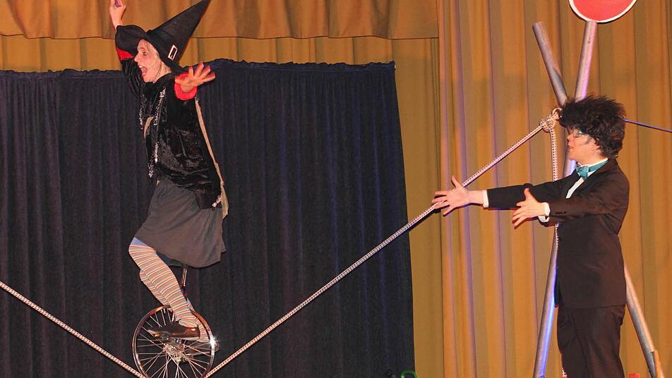 Das großartige Abenteuer der "Hexe Knallpurga" ging am Samstag über die Bühne der Franz-Hofmann-Halle in Knetzgau. Knallpurga will mit ihrem Flugbesen "Pilatus Absturtz" zum Mond. Aufgeregt wie sie ist verfliegt sie sich und landet auf einem Seil mitten im Weltall. Auf einem Seil?