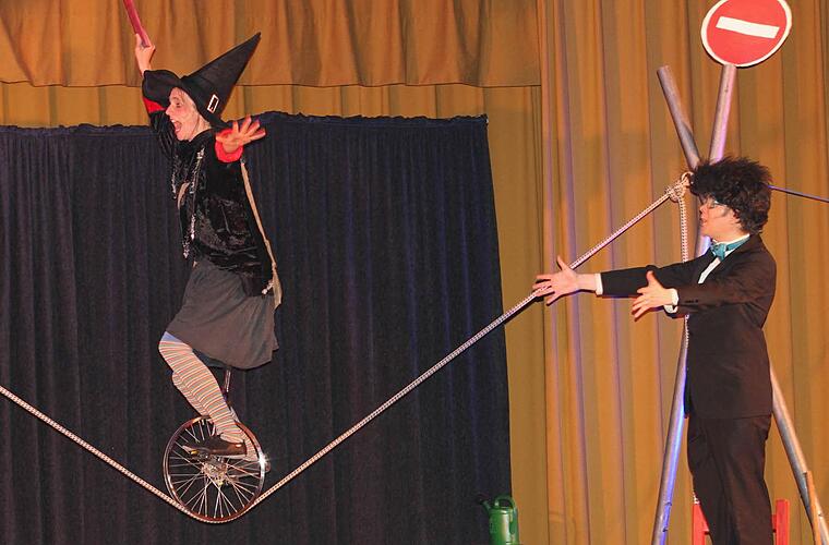 Wie geht es weiter mit der Hexe Knallburga? Ganz schön wacklig steht sie auf dem Seil im Weltall. Zum Glück hat Knallpurga ihr Balancier-Examen dabei, und das spürt man bei jeder Bewegung auf dem Seil, das bedenklich durchhängt. Mit Eleganz und faszinierender Akrobatik entführt die Hexe (Annette Will) ihr Publikum in ihre fabelhafte Welt. Bange machen galt dabei nicht, und bei ihren artistischen Höchstleistungen auf dem Seil blieb manchem Kind der Mund offen stehen. Laufen auf dem Seil, sitzen auf dem Stuhl, der auf dem Seil steht, über dem Planeten, Jonglieren und sogar Einradfahren zeigte sie so, als wenn sie auf einer großen Autobahn unterwegs wäre.