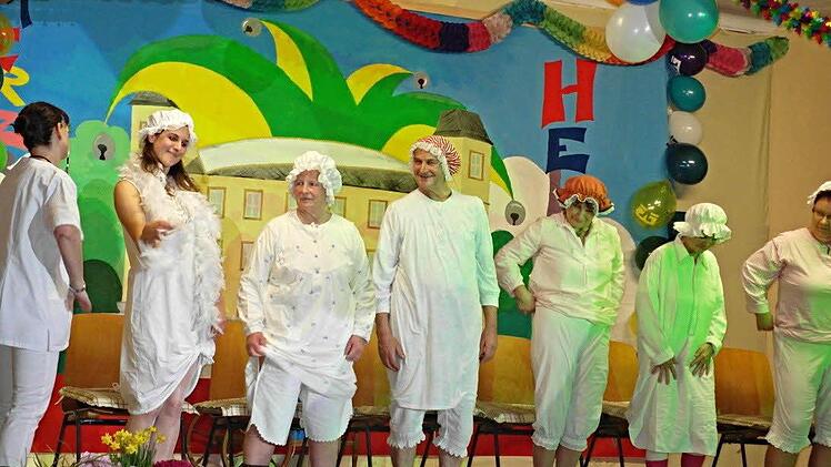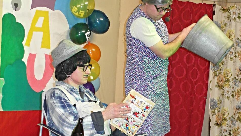 Dass in der Pflege weder Zeit noch Geld vorhanden ist, stellte der Gesangsverein Untermerzbach in einer Slapstick-Einlage zur Schau. So musste unter den Insassen des Altersheimes, angeführt von der mit Trillerpfeife bewaffneten, resoluten, dauergestressten Schwester Erika, alles geteilt werden: vom Waschlappen bis zur Klo-/Zahnbürste - selbst der Schluck Wasser zum Ausspülen musste weitergereicht werden, sehr zum Vergnügen des Publikums, welches am Ende mit dem Inhalt der jeweiligen Nachttöpfe "beglückt" wurde.