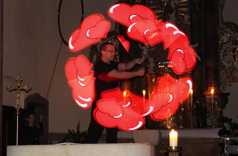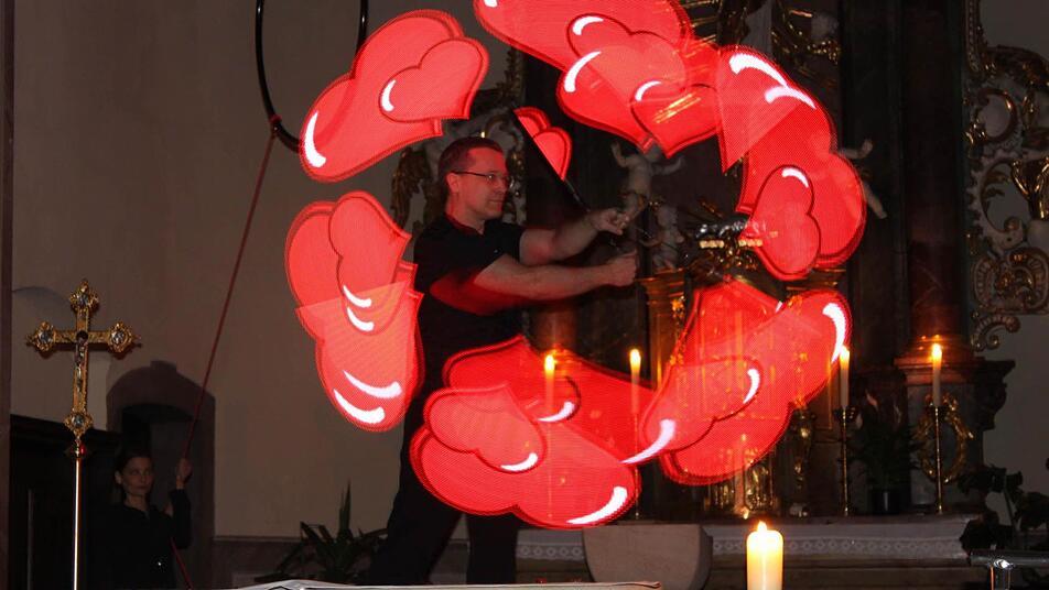 Da passte es gut, dass das Schweinfurter Duo "Firlefanz" mit Silke und Matthias Ebert eine tolle Performance gab. Viele Besucher zeigten sich beeindruckt von der akrobatischen Einlage. Diese führte Silke Ebert an einem herabhängenden Ring im Altarraum vor. Mit Hilfe von einem "akrobatischen Beamer" erzeugte Matthias Ebert in der dunklen Kirche zudem Lichteffekte, die zentrale Worte und Symbole rund um das Thema "Liebe" projizierten. So war von vielen Besuchern am Ende einer außergewöhnlichen Sinnzeit zu hören: "Das war heute einmalig".
