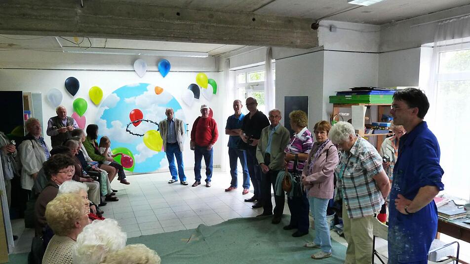 Nach kontroversen Diskussionen über den Entwurf seines Werkes hatte Gerhard Rießbeck die Eberner Gemeindemitglieder zu einem Besuch seines Ateliers eingeladen. Nun, da das Kunstwerk fertig gestellt ist - nur einige Luftballons sind noch in Arbeit - gab es das erste Erstaunen schon, da das Atelier nicht einer der hübschen Windsheimer Altstadtgassen zu finden war, sondern in großzügigen, hellen Räumen mitten in einem Neubaugebiet. Das nächste Erstaunen galt der Größe der beeindruckenden Malereien Rießbecks, von denen mehrere fast Deckenhöhe erreichen.