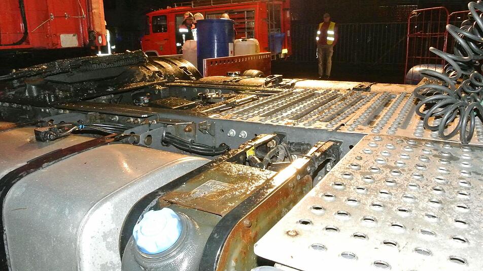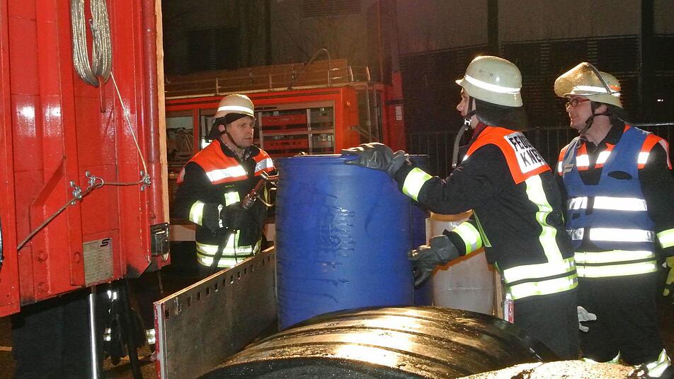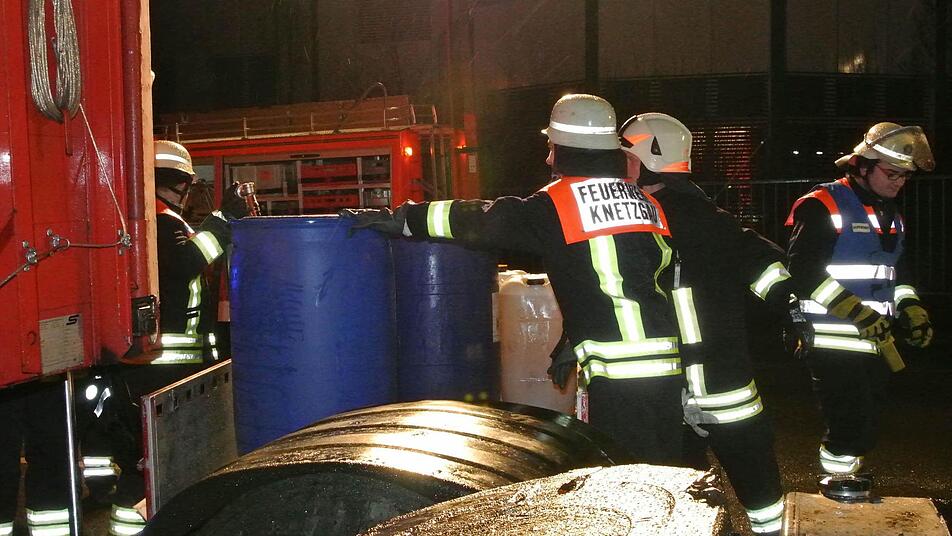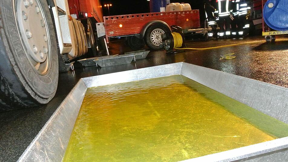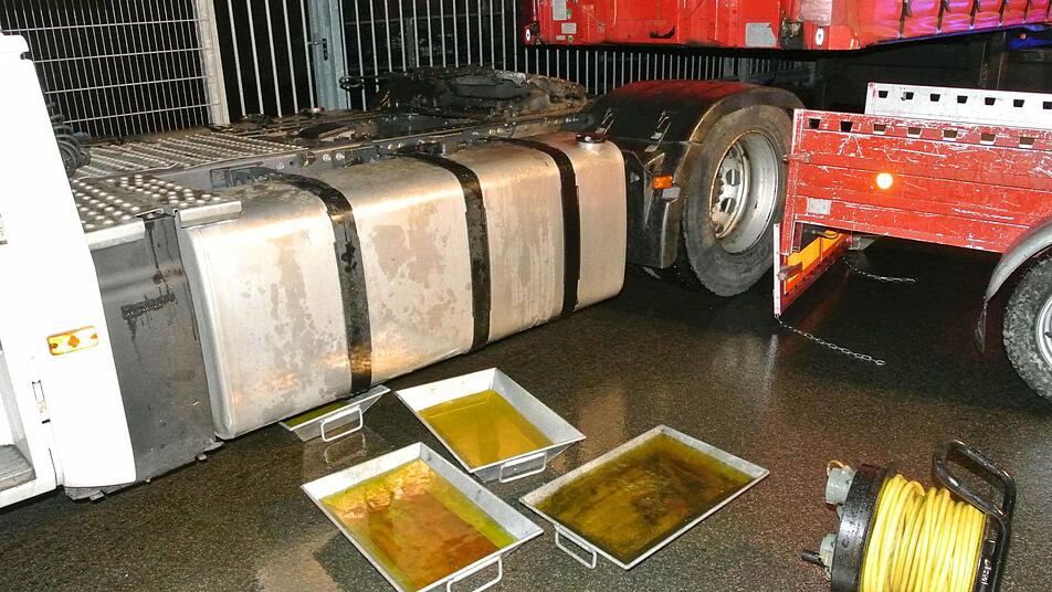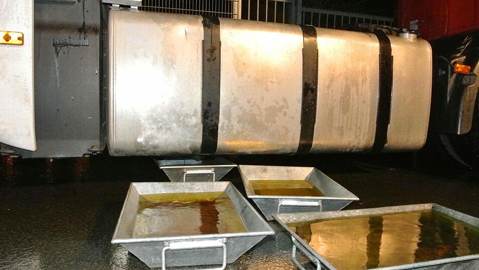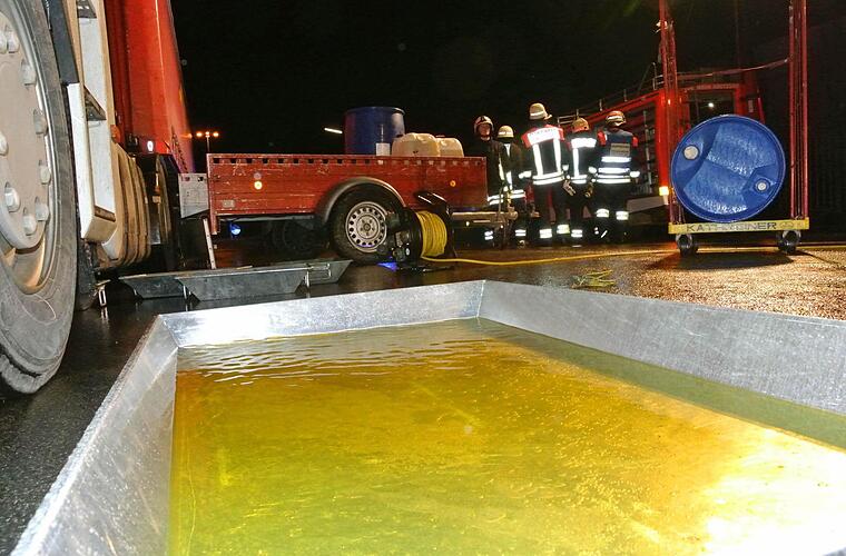 Von dem Lastwagenfahrer fehlt noch jede Spur. An Ort und Stelle im Knetzgauer Gewerbegebiet pumpten die ehrenamtlichen Helfer der Freiwilligen Feuerwehr gut 200 Liter Diesel aus dem Doppeltank der Zugmaschine und fingen außerdem auslaufenden Diesel in großen Zinkwannen ein. In der ganzen Gegend roch es nach dem Treibstoff.