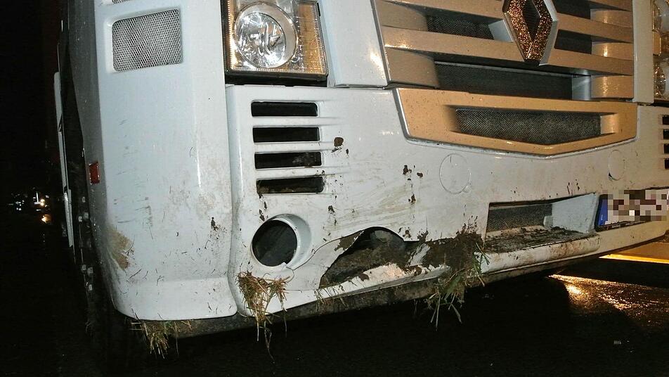 Am Donnerstagabend gegen 19.30 Uhr war ein Lastwagenfahrer mit seinem Truck von Richtung Donnersdorf in Richtung Knetzgau unterwegs. Auf der Höhe von Wohnau, so rekonstruierten Polizei und Feuerwehren später, ist er von der Fahrbahn abgekommen und in den Graben gefahren. Dort belegt eine gut 50 Meter lange Schleifspur, dass der "Brummifahrer" mit seinem Gespann harten Bodenkontakt hatte. Dabei muss die Tankanlage der Zugeinheit beschädigt und aufgerissen worden sein.
