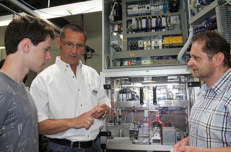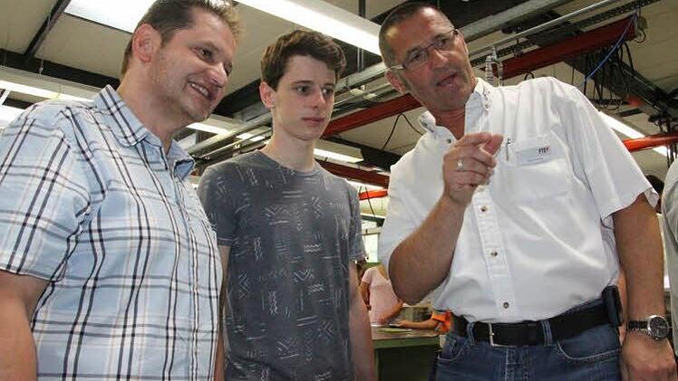 Mechatronik ist gefragt Joshua Herz aus Eyrichshof war mit seinem Vater Paul gekommen, der bei FTE beschäftigt ist. Der 16-jährige Joshua besucht das Friedrich-Rückert-Gymnasium in Ebern und wollte sich Informationen direkt vor Ort holen. "Ich finde es gut, dass man mal ganz zwanglos in die Lehrwerkstatt schauen kann. Ich habe mich noch nicht entschlossen was ich mal mache, aber was in Richtung Mechatroniker könnte ich mir schon vorstellen", sagt Joshua. Zuvor hat er von Uwe Werner, der als Ausbilder für den Elektrobereich zuständig ist, an einem Schaltkasten reichhaltige Informationen erhalten.