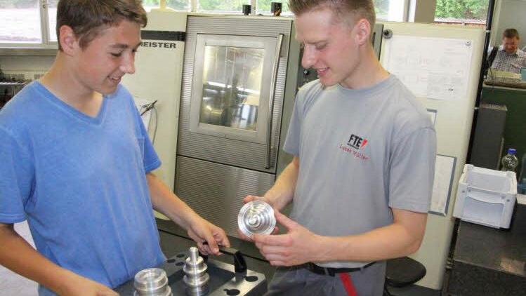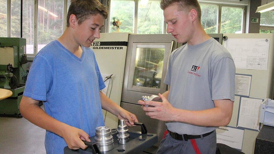 Julian Schneider aus Holzhausen hat sich Lukas Müller, der sich im zweiten Ausbildungsjahr als Zerspanungsmechaniker befindet, als "Informations-Coach" ausgesucht. Vor den beiden liegen einige Werkstücke auf dem Tisch, die Lukas Müller dem wissbegierigen Hofheimer Realschüler Julian erklärt.