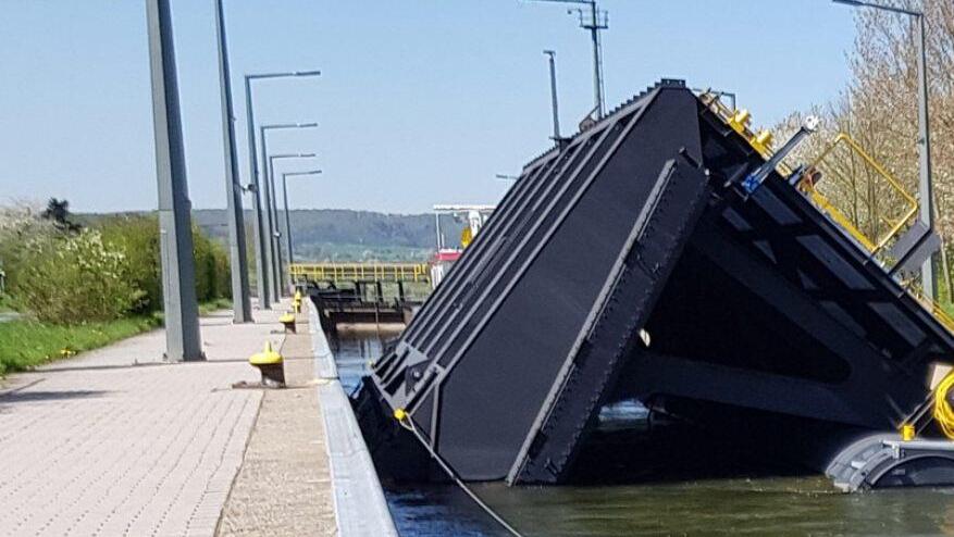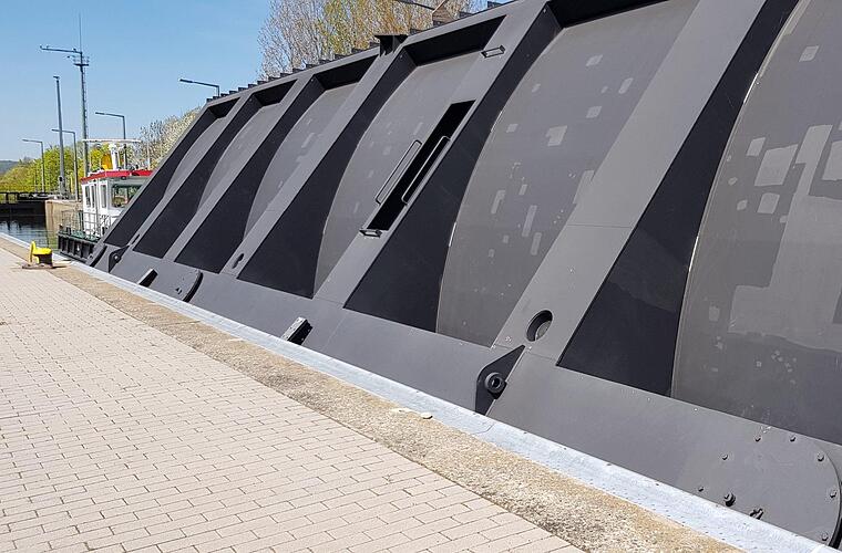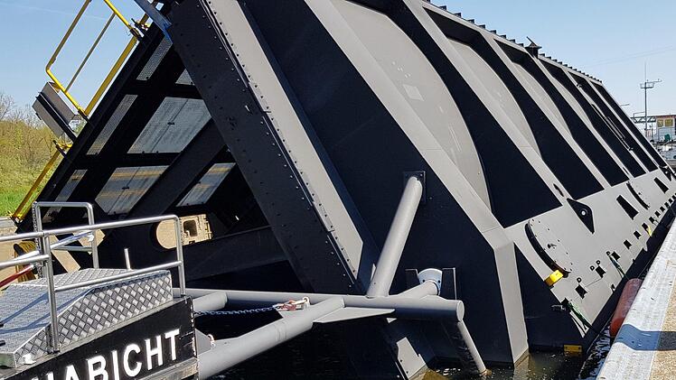Das tonnenschwere neue Monstrum ist über 30 Meter lang und verfügt über zwei Schwimmkammern nach dem Katamaran-Prinzip. Allerdings sehen diese unterschiedlich aus: Der eine Auftriebskörper ist rund, der andere wirkt eher wie eine Wand. Ist auch eine, denn an die richtige Stelle gesetzt, kann man diesen Teil des Revisionsverschlusses mit Wasser fluten, worauf er sich ins Flusswasser senkt, eine Arbeitsplattform ergibt und wie ein Schott fungiert.