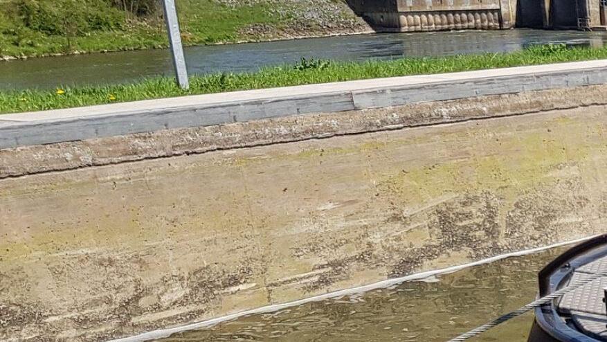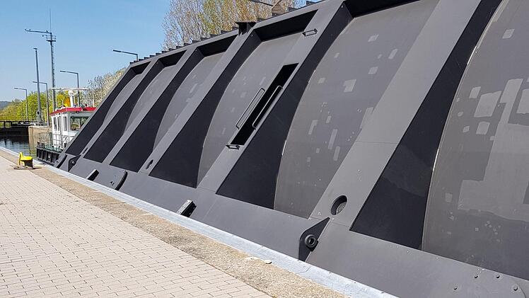 Beispielsweise aktuell jetzt am Vierether Wehr. Abgedichtet vom Flusswasser ergibt sich mit Hilfe des Revisionsverschlusses der Arbeitsraum, um jeweils eine Wehrtommel auszubauen und zu ersetzen. Die beiden über 30 Meter breiten Stahltrommeln müssen ausgetauscht werden, ebenso die Wehrstege, die über das Wehr führen, sie liegen an der Schleuse schon bereit. "Viereth wird eine große Baustelle", weiß Schiffsführer Sascha Friedrich.