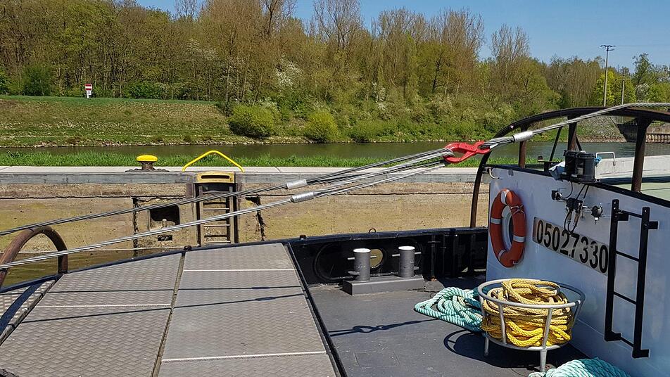Die "Angermünde" und der "Habicht", ein kleineres Streckenfahrzeug, das hinten quasi als "Bremser" fungierte, haben in den vergangenen Tagen, den Revisionsverschluss zwischen sich, das Schleppen "geübt". Verschiedene Schub- und Zugversuche brauchte es schon, um ein Gefühl für den Neuzugang zu entwickeln. So ein 120-Meter-Gespann reagiert ganz anders, als ein Binnenschiff-Schubverband. Die Sonderfahrt war wichtig und natürlich im Skipper-Alltag ein Erlebnis. Denn das Schleppen, erklärt Friedrich, ist auf dem Main verboten, das geht nur mit Sondererlaubnis und Signalzeichen. Die einzigen, die jetzt auf dem Main schippern durften, waren Schiffsführer Sascha Friedrich und sein Team - was das breite Grinsen auch erklärt.