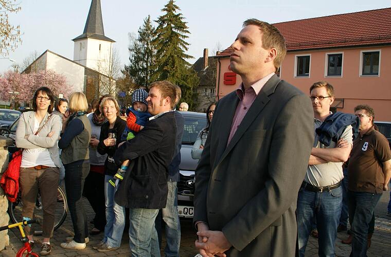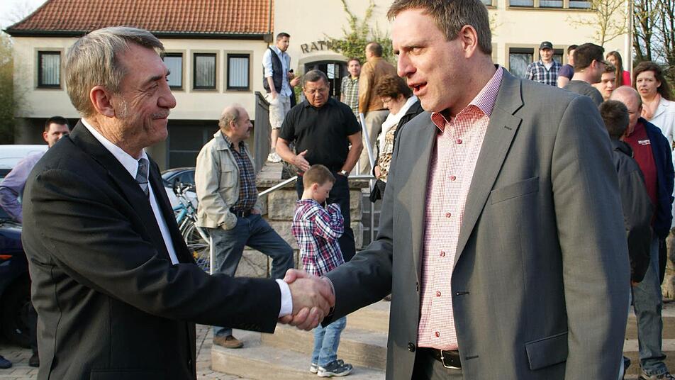 Dann trat Oskar Ebert auf die Treppe heraus und verkündete, dass er sein Amt am 1. Mai in die Hände von Matthias Bäuerlein legen wird. Der musste erst einmal tief durchatmen, als lauter Applaus aufbrandete. Einer der ersten Gratulanten war Alexander Leicht. Beide bescheinigten sich einen fairen und sachorientierten Wahlkampf und sind überzeugt, dass sie im Gemeinderat zielorientiert zusammenarbeiten werden.