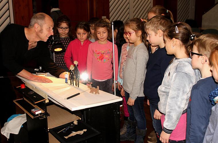 Eine Geschichte, die von Wichtigem erzählt, von Wertschätzung und Anteilnahme, von Loslassen und Traurigkeit und von Hilfsbereitschaft, sahen die Buben und Mädchen aus den Kindergärten und der Grundschule. Dies alles geschah im "Schattentheater" mit dem Titel "Matti's Geschenk", das Künstler Norbert Götz auf besondere Weise darbot.