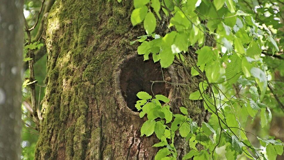 Etwas darunter befindet sich ein kleineres Loch in der alten Eiche. Baummarder oder Siebenschläfer, vermutet der Forstmann dort. Auch Amseln nehmen solche Baumhöhlen gern an.