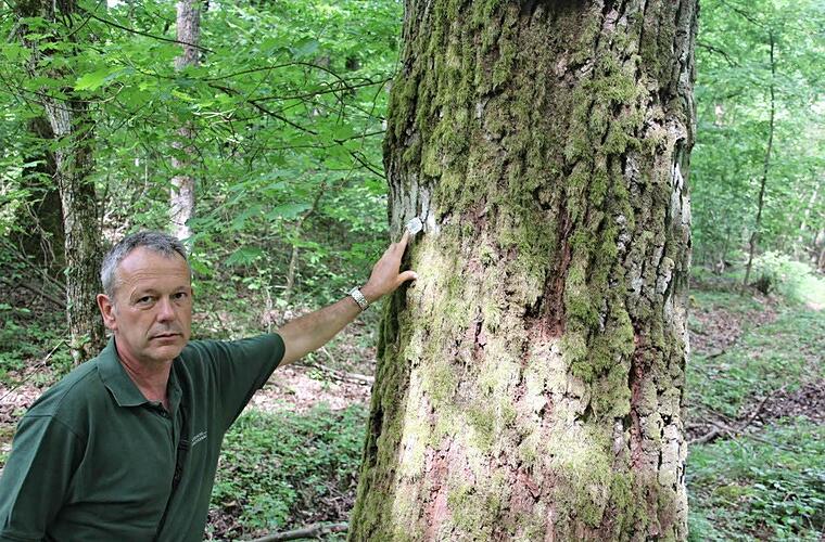 Einige Schritte gegangen, zeigt der Forstbeamte auf einen Feldahorn. "Das ist der Baum des Jahres 2015." Totholz, so sagt Gnannt, sei ein wichtiges Element des Naturschutzes. Während er das sagt, ertönt hoch oben der Zwitschergesang eines Pirols. Wegen des Laubs ist der kleine gelbe Kerl mit seinen schwarzen Schwingen nur schlecht zu sehen. In dem Waldstück, der Förster bezeichnet es als "Mittelwald", sind Bäume mit ganz unterschiedlichem Umfang zu sehen, viele Eichen sind dabei.