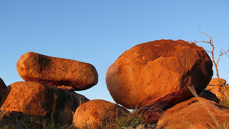 Dass der Teufel mit ziemlich großen Murmeln spielt, sah der Traveller bei den "Devil´s Marbles". Dabei handelt es sich um eine Ansammlung von im Laufe von Jahrmillionen kugelförmig geschliffenen Basalt-"Bollern", wie man im Fränkischen sagen würde. Karlu, karlu heißt diese heilige Stätte bei den Aborigines. In ihrem Glauben handelt es sich um die Eier der Regenbogenschlange.