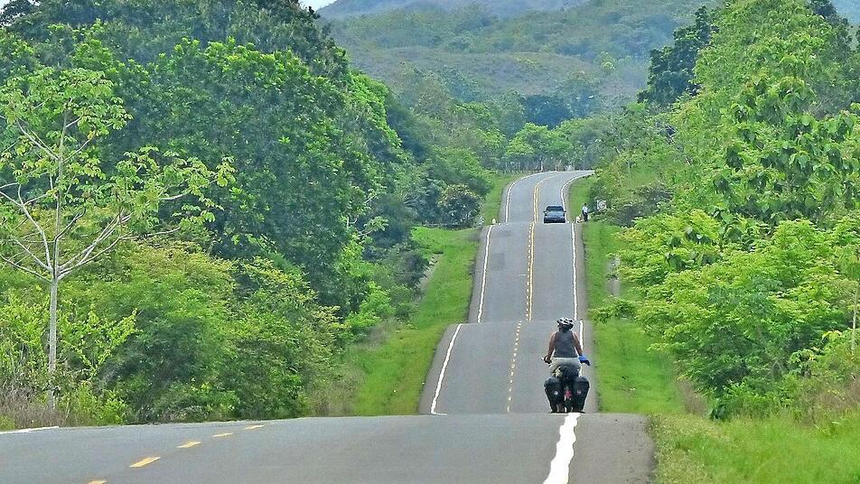 Dass es sich nicht um eine reine Genusstour handelt, wird spätestens in El Salvador klar. Hier geht es bei schweißtreibenden Temperaturen von weit über 40 Grad in der heißen Sonne steil in die Berge. Die wollen bezwungen sein, will man die Panamericana erreichen, die nahe des Pazifiks verläuft. Diese legendäre Straße durchzieht den gesamten amerikanischen Kontinent von Alaska bis Feuerland. Zeitweise ist die Trasse schmal wie eine deutsche Kreisstraße, auf der sich jedoch ein Schwerlastverkehr wie auf einer Autobahn bewegt. Die großen Lkws und Busse kommen bis auf Tuchfühlung an die vollbepackten Räder ran - Stress pur für die Radfreaks. Zeitweise weichen sie auf Nebenstrecken aus, doch nicht überall gibt es diese Alternative.