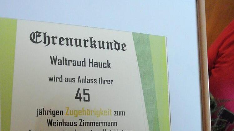 Waltraud Hauck wurde über die Jahre zu einem Markenzeichen im Hause Zimmermann. Wolfgang Zimmermann sagte zu ihr: "Du wirst nicht gekündigt, du gehörst zum lebenden Inventar." Und er machte ernst, bis sich jetzt Waltraud Hauck aus eigenen Stücken "abmeldete". Für die Ehrenurkunde für Waltraud Hauck reimte der Chef: "Nimm unseren Respekt entgegen. Solche wie dich, die muss man gut pflegen."
