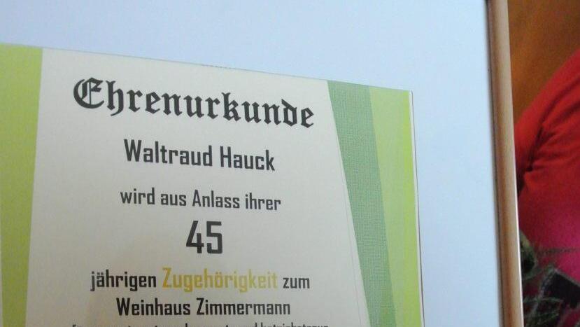 Auf der anderen Seite der Medaille stehen die Mindestlöhne, befristete Beschäftigungen, Zeitarbeit. Ein Arbeitsverhältnis, wie es heute kaum an der Tagesordnung ist, fand dieser Tage im Weinhaus Zimmermann seinen würdigen Abschluss: Winzer und Wirt Wolfgang Zimmermann dankte seiner "rechten Hand" Waltraud Hauck für ihre Dienste. 45 Jahre hat sie im Gasthaus "Zur Sonne" bedient, geholfen, gewirkt - war Mädchen für alles und guter Geist im Haus.