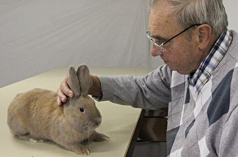Seit fast 60 Jahren ist Oskar Vogel als Kleintierzüchter aktiv. Bei der 30. Jungtierschau in Untermerzbach ist er mit einem Kaninchen erfolgreich.